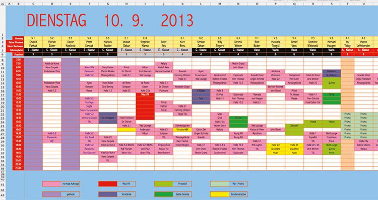 Planung VIP Shuttle Service Um jederzeit eine exakte Planung des VIP Shuttle Service zu gewährleisten, haben wir eine Übersicht mit allen relevanten Details in einer speziellen Google Drive Cloud erstellt. In dieser Planungsliste lassen sich in Echtzeit von mehreren Mitarbeitern gleichzeitig Änder- ungen vornehmen. Diese Änderungen können auch mobil über Laptop, IPad oder Smartphone erfolgen. Alle Einträge werden unter den jeweiligen Benutzernamen gespeichert, sodaß alle vorgenommenen Änderungen immer genau dokumentiert werden. Zusätzlich wird auf unserem Server nach jeder Änderung eine Sicherungskopie erstellt, welche auch offline abgerufen werden kann. |